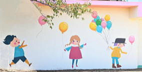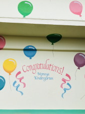| アートペインティングのコンセプト (正門入口の少女) 子どもたちがまだ何もわからない将来への憧れ、幼心に素敵な笑顔の人に漠然と「あのお姉さん好きだな。」とか、「私もあんな風になりたいな。」と思ったことが誰でも一度はあると思います。その様な気持ちの中で夢や希望をたくさん持った人(風船はふくらんだ夢や希望)と、明るく楽しい未来を想像できる絵にしました。子どもたちが将来には夢や希望がたくさん詰まっていると信じられる様な絵を描きました。 (園舎1F) 「ありがとう」の気持ちや、してはいけない事をした時に「ごめんなさい」と云う気持ちはとても大切です。それ同様に相手に対して素直に心から「おめでとう」と言える子どもに育ってもらいたい。誰かが合格した時、友人が結婚した時、色々なおめでとうが、たくさんあります。そして子どもたちの成長は、私ども教師は勿論ですが保護者の皆様は喜びも一入かと思います。 そんな中、入園、卒園、お誕生日などに、Congratulations!の前で写真を撮ってください。お子様の成長した様子を感じ取る事が出来ると思います。卒園の頃には身長が伸び、字が隠れてしまうかもしれませんが教職員一同、園児の皆さんにCongratulations!を心を込めて贈りたいと思い描きました。園児の皆さんに、「明るい未来へつながる楽しい幼稚園」と思って頂けたら幸いです。 |