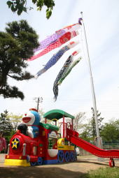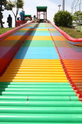 ![]() ドラえもん機関車から伸びる 長いローラー滑り台 |